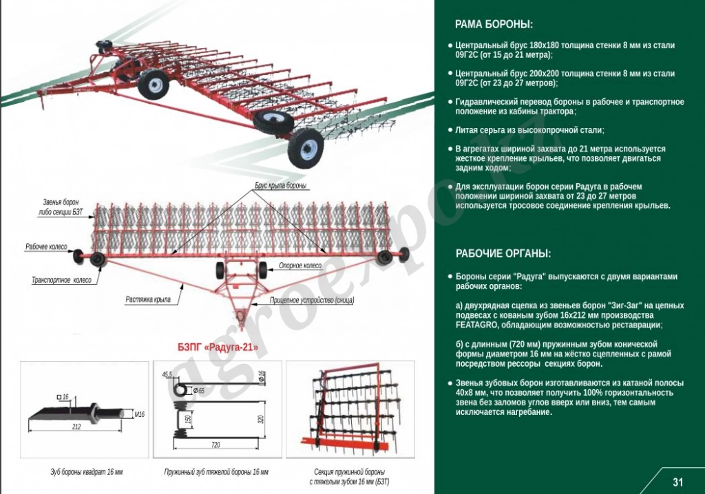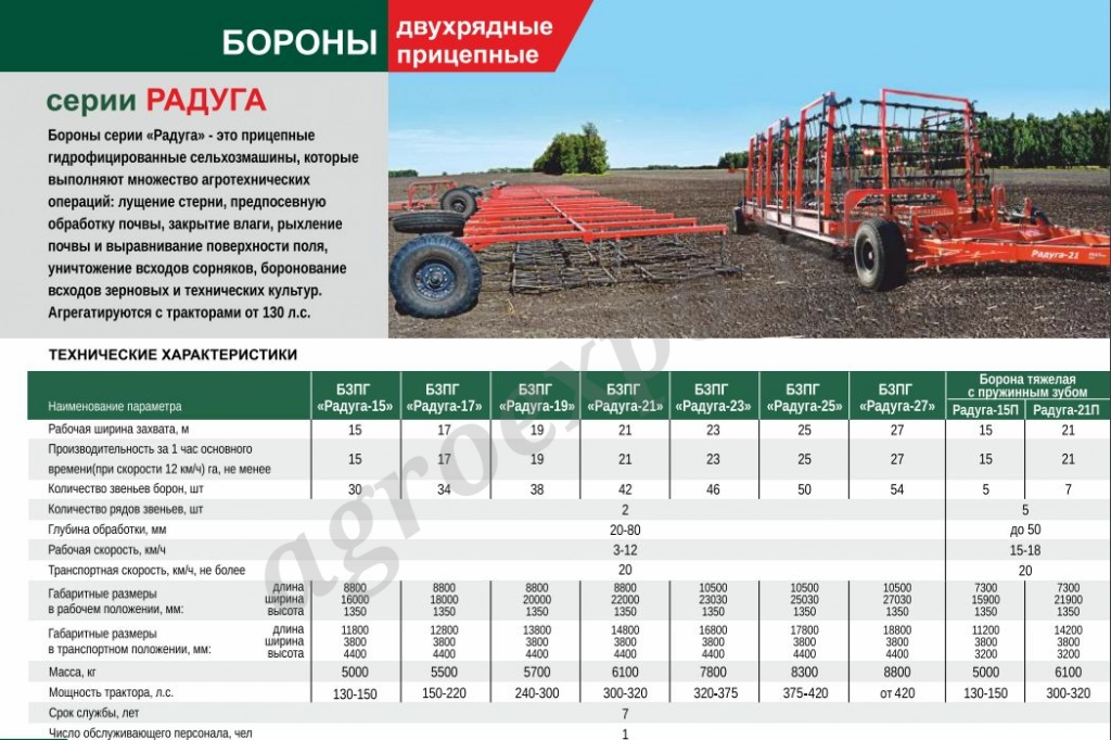 Бороны серии «Радуга» - это прицепные гидрофицированные сельхозмашины, которые выполняют множество агротехнических операций: лущение стерни, предпосевную обработку почвы, закрытие влаги, рыхление почвы и выравнивание поверхности поля, уничтожение всходов сорняков, боронование всходов зерновых и технических культур. Агрегатируются с тракторами от 130 л.с.