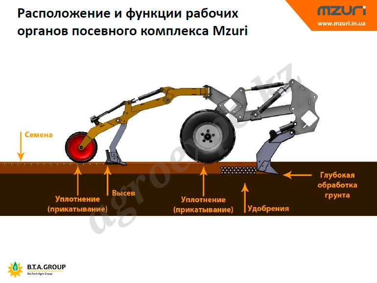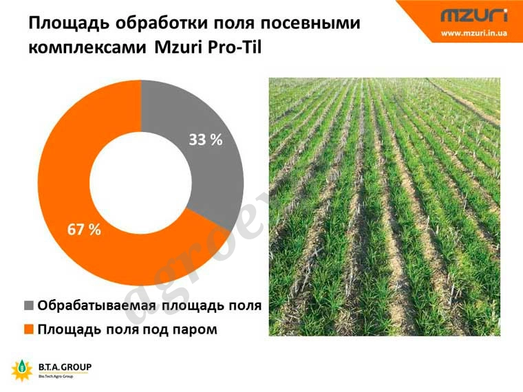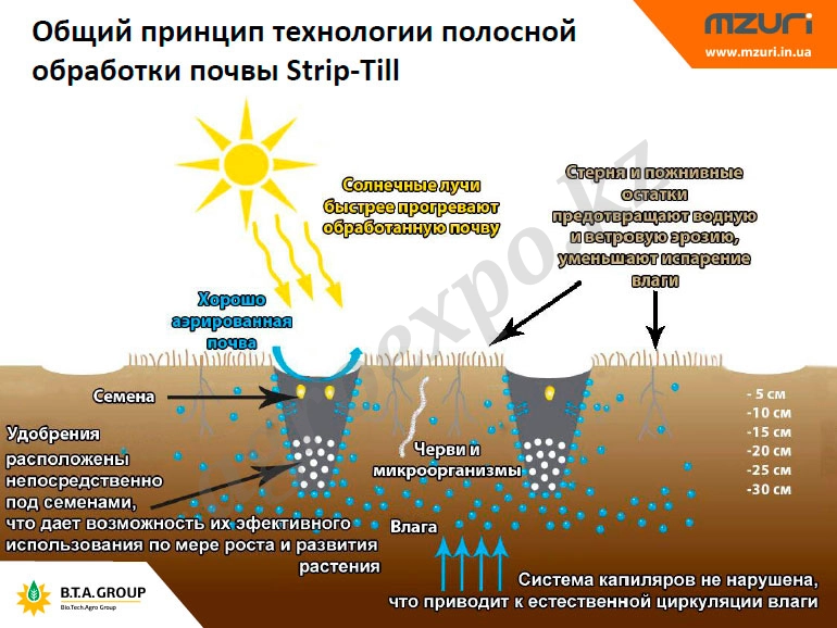 Технология Strip-till от Mzuri Pro-til, способствует восстановлению плодородных качеств грунта, развитию в нём микробиотики, а также предотвращает появление плужной подошвы, ветровой и водной эрозии и прочих негативных явлений. Использование посевных комплексов Mzuri Pro-til позволяет создать идеальное посевное ложе для получения дружных всходов, способных противостоять различным климатическим стрессам, а также максимально раскрыть свой генетический потенциал.